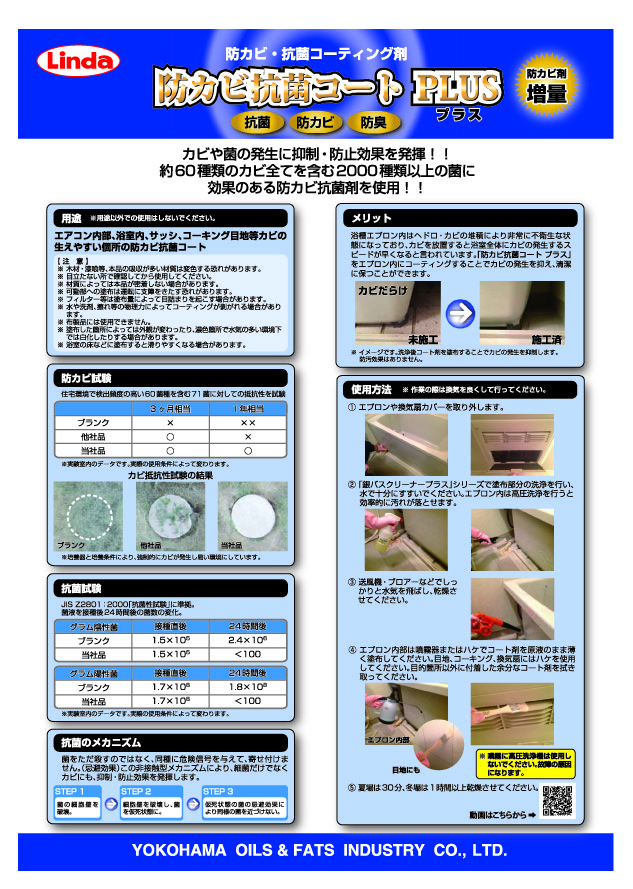| 用途 | エアコン内部・浴室内(エプロン内・壁面の目地・コーキング・換気扇)の防カビ・抗菌コート |
