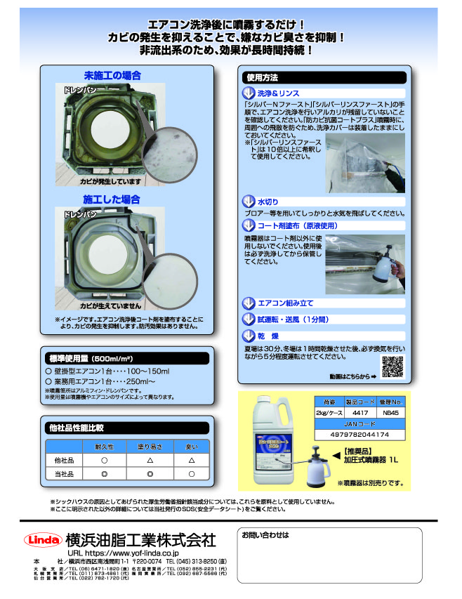 - エアコン洗浄後にアルミフィンやドレンパン等に塗布することで、カビや細菌の繁殖を抑制。